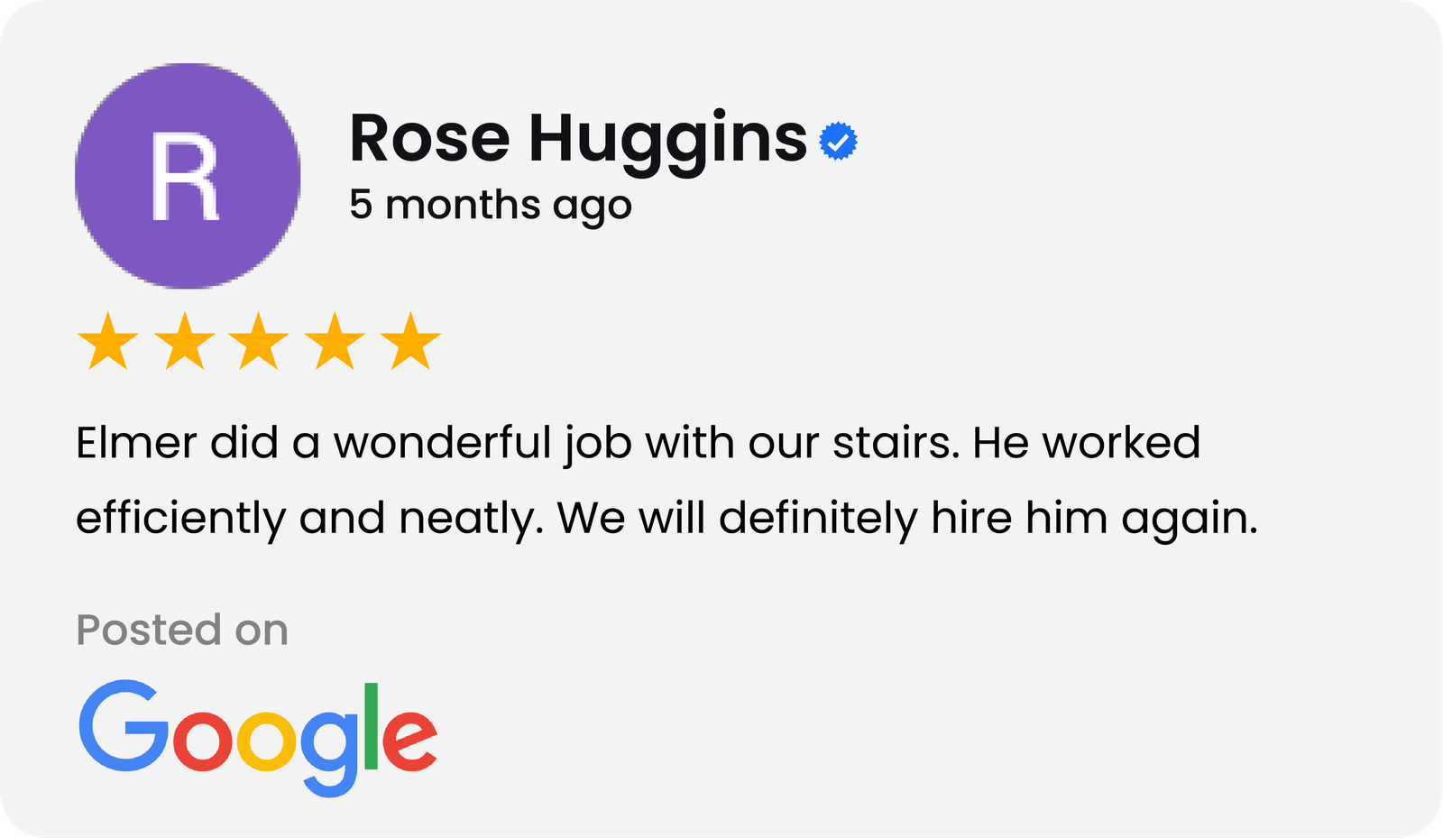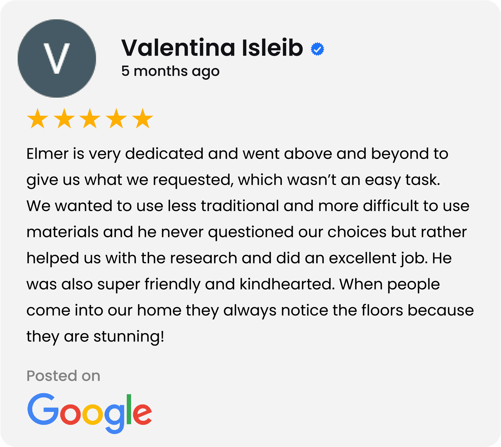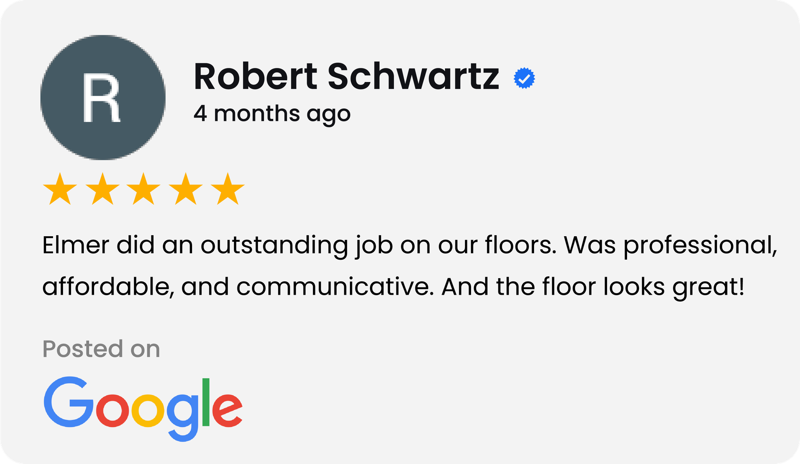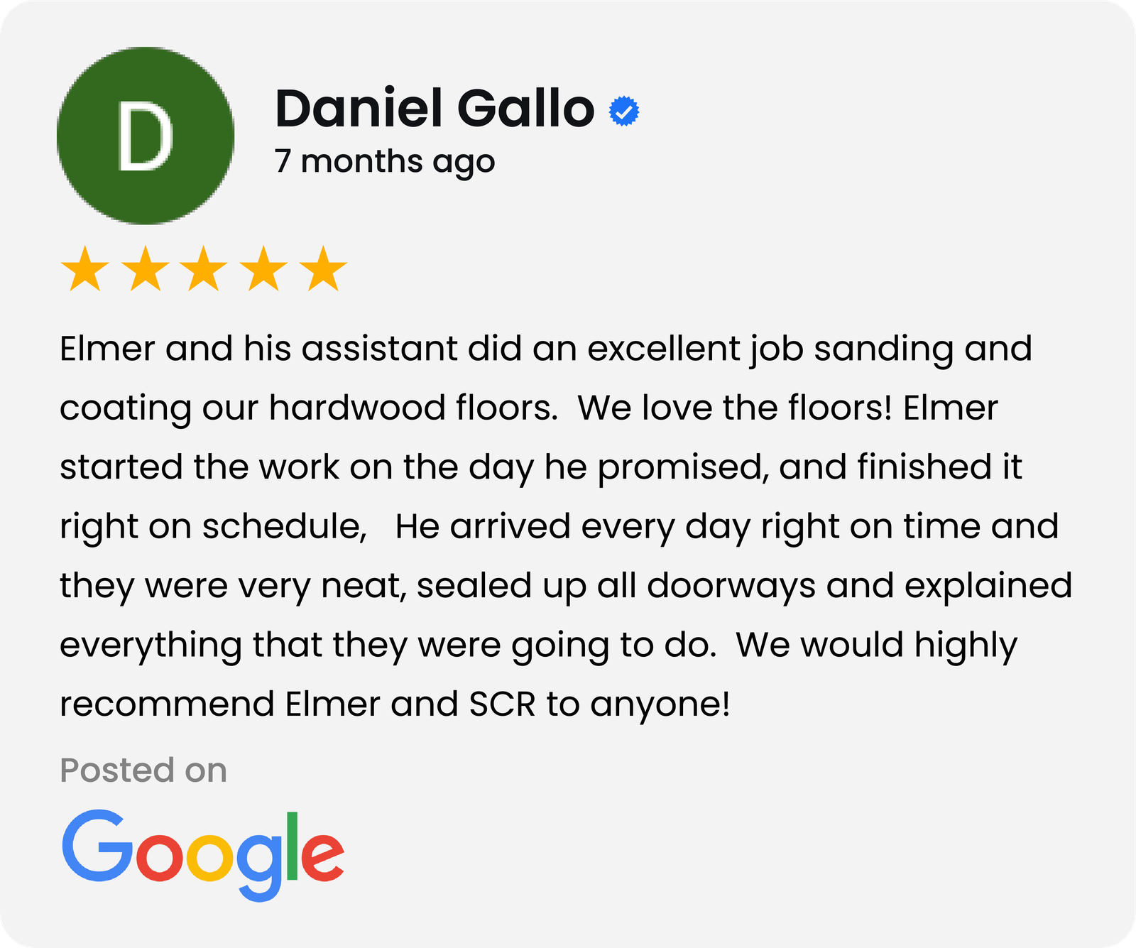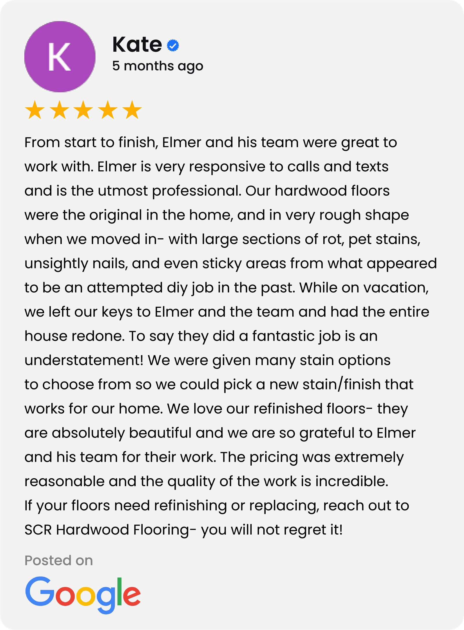 Elmer was a true professional in every aspect of our project, which was about 530 sf, kitchen and bkfst room. He told us in advance when he was available, gave us the price, flexed the start date when we needed to move it, and showed up every day, starting on a Saturday. He kept me informed of every step, and was couteous and friendly. He started with a sanded patch and gave us 3 colors to choose. Even helped me move 2 chairs. The work, dark stain on maple with a satin finish, is gorgeous. I have already given his name to 3 friends.