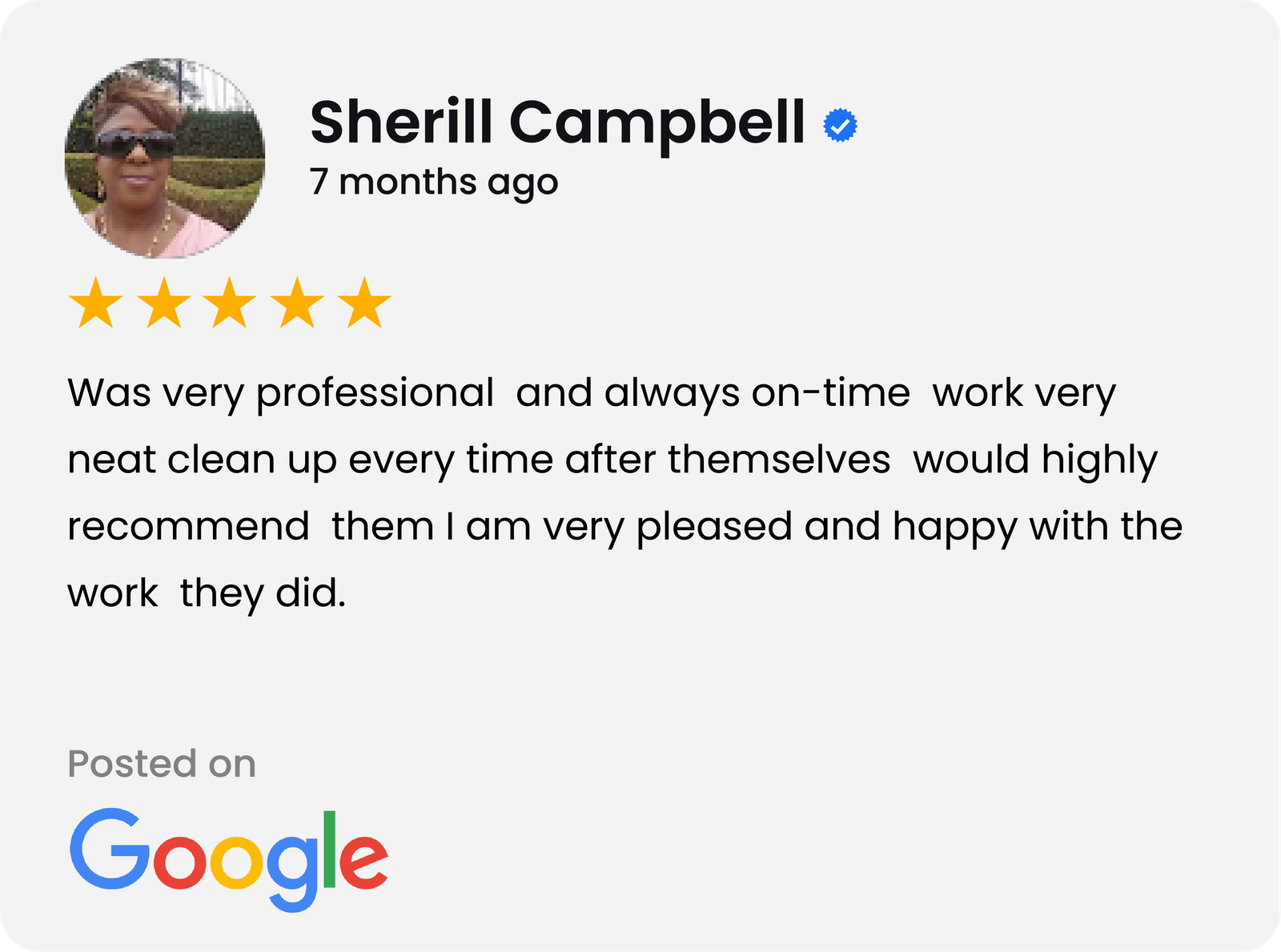 They were hard working, courteous and on time. They did quality work,and did not waste time. They actually cleaned up after they finished! I was impressed. I definitely recommend them.